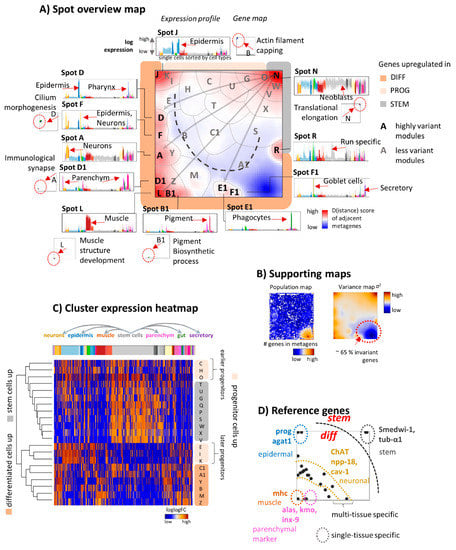 The single-cell transcriptomic landscape of the planarian Schmidtea mediterranea: (A) The module overexpression map provides an overview about modules of co-expressed and highly variant genes. They mainly arrange along the edges of the SOM and are labeled with bold capital letters A, D, F, J, L, N, R, B1, D1, E1, F1. The grey arrows illustrate selected developmental paths by linking the stemness spot N with the respective “tissue” spots. Expression profiles (gene set enrichment Z-score, GSZ-scale) and gene maps of selected functional gene sets underpin the functional context of these modules. They reveal specific up- and downregulation of the gene sets in different tissues (red arrows). The gene maps indicate the location of the genes by dots. Accumulation of genes in and near module areas are indicated by red arrows and dashed ellipses. (B) Population and variance maps visualize the number of genes in each metagene (log-scale) and the variance of metagene expression, respectively. About 65% of all genes studied show virtually invariant expression. They accumulate in the blue area in the right lower corner as indicated. (C) Expression profiles of the modules of low variant expression (labelled with non-bold letters in part A) are shown as heatmap. The arrows above the heatmap point in the direction of differentiation from stem cells into different tissues. The spot modules group roughly into three clusters as indicated in the right part of the heatmap and along the edges of the SOM in part A. (D) Location of key reference genes are shown by dots (see also Figure S2 and Table S1). They are mostly found in or near the spots which upregulate in the respective tissues.