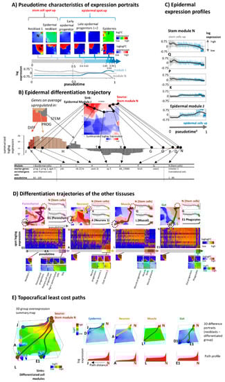 In the next step, we aimed at characterizing gene-state expression dynamics during differentiation. For a simple first view, we ordered the expression portraits of the cells of epidermal differentiation along the linear, unbranched pseudotime path taken from Plass and colleagues [29] (Figure 4A). Hereby the stemness module is highly expressed in the portraits of stem cells, of epidermal neoblast, as well as in epidermal progenitors. Its amplitude however progressively decays in the portraits of early and late epidermal progenitors but then markedly decays in the portraits of differentiated epidermal cells. On the other hand, the expression of the epidermal module progressively increases in an antagonistic fashion. Notably, this switching affects about 1000 genes included in these two modules. We replot the default “logFC”-scaled portrait into double-logarithmic “loglogFC” scale in order to better visualize subtle expression changes upon differentiation. The red overexpression region “flows” along the upper border of the map in direction from the stemness “source” spot at the right toward the epidermis “sink” module at the left. A gene-state trajectory of epidermal differentiation was computed using the maximum flow algorithm [10] as described in the methods section. Briefly, the trajectory is obtained as directed graph linking the source and sink module via the path of maximum cumulative expression between the adjacent modules along the path (Figure 4B). As expected, the trajectory follows the right-to-left shift of the red overexpression region seen in the portraits upon differentiation. The expression of stemness genes decays along the trajectory and it increases for genes involved in epidermis differentiation (Figure 4C). Gene-state trajectories of differentiation, pt profiles, and associated expression portraits of parenchymal, neuronal, muscular, and gut tissues are shown in Figure 4D. Hereby, differentiation is described by trajectories starting in the common stemness mode and ending in the respective tissue-specific expression modules.