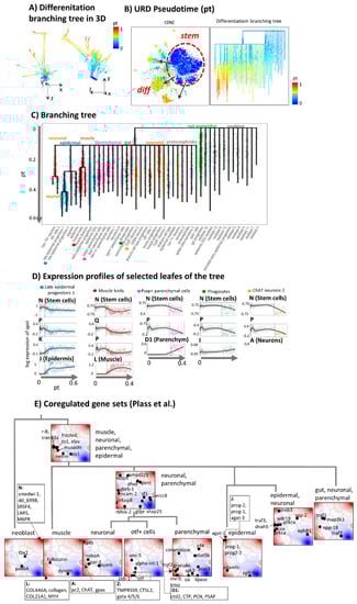 The unbranched pt approach applied in the previous subsection sorts the cells along one dimension independent of the cell type. A more realistic computational approach is provided by URD [40]. It splits the pt path of planarian tissue development into a tree-like, multibranched one. The algorithm applies diffusion-like random walks to search for graphs through cellular states. The obtained trajectory starts with a common trunk of neoblast cells for early pseudotime values at pt < 0.6 (blue color in Figure 5A,B). Subsequently it divides into tissue-specific branches at pt > 0.6 (yellow to red). Notably, the multibranched tree obtained by means of the URD algorithm reproduces the differentiated cell types identified by independent methods in the original publication [29]. Different visualizations of URD branching in terms of a 3D cell cloud (Figure 5A), of a path-tree or t-SNE plots (Figure 5B) enable inspection of paths under different perspectives. The tree describes differentiation into more than thirty final tissue types via 13 progenitor populations (Figure 5C). Initial stemness states stratify into a variety of neoblast and progenitor cells such as gut and early epidermal progenitors at pt = 0. Subsequently, the main branch splits the trajectory into sub-branches describing differentiation into tissues such as parenchymal, neuronal, proto-nephridial, and diverse epidermal and gut cells. Further branching separates late epidermal progenitors, pigment and epidermis cells, muscle body and muscle pharynx cells, and npp-18 and otf+ cell neurons.