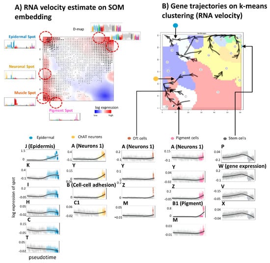 We have previously shown that the arrangement of spots indeed reflects dynamics of different processes. For example, melanoma progression from naevi to metastatic tumors has been analyzed by combining SOM portrayal and pt-scaling of bulk melanoma transcriptomes [24] and single-cell data of melanoma cell cultures [19,25]. Another study addressed organoid development of liver buds using a similar approach [26]. The ability to deduce dynamic information in SOM gene-state space from cross-sectional data was supported by (real) time-resolved SOM-analyses of the longitudinal transcriptomic changes along the yeast cycle [27], of dynamic changes of urine proteomics during space flight simulations of human individuals [28] and, earlier, equilibration of cellular states after external perturbations into stable attractor states [29,30]. In these applications SOM provided trajectories in the molecular landscapes. The studies so far associate with relatively simple linear, circular, bifurcation-like, and converging processes. Furthermore, the trajectories in feature-space were deduced more on a qualitative level without underpinning them with appropriate computational methods. Finally and most importantly, single cell “omic” technologies strongly evolve and now became standard in many applications beyond the flatworm example used here. Presently, many ten-thousands of cells are sequenced in parallel, quality of transcriptomic data is improved, technology is refined, e.g., in direction of spatially resolved transcriptomics, and extended by single-cell proteomics, genetics, and chromatin accessibility methods.