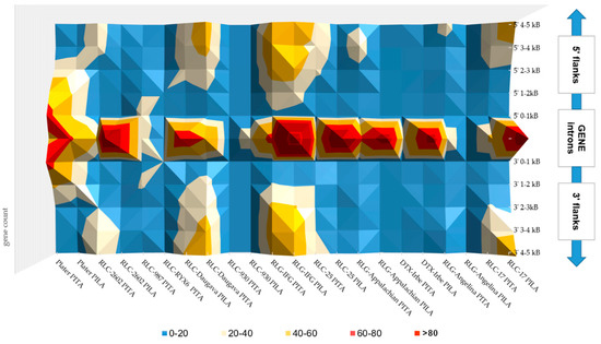 The GC content was calculated for pine TEs (File S9). The TE-associated GC content for each gene involved in the Daugava RLX network was evaluated (File S7C,E). However, the GC content for full-length introns could be biased due to masked TE parts in the gene introns and flanks. Therefore, patterns of identified TEs were considered, and the GC content of each full-length TE was counted for each gene intron. The overall average GC content for introns was 39% for P. taeda and 41% for P. lambertiana, which were even lower if only short hits to LTRs were considered (27% and 36%, respectively). This could be explained by the lower GC content of LTRs of some RLXs distributed in the gene introns. The mean GC content of the gene transcripts (involved in the Daugava RLX network) was 44% for P. lambertiana and P. taeda, which was higher than any average estimate for introns and published estimates for whole BAC clones and whole genome sequences of gymnosperms (38%, [91,92]).