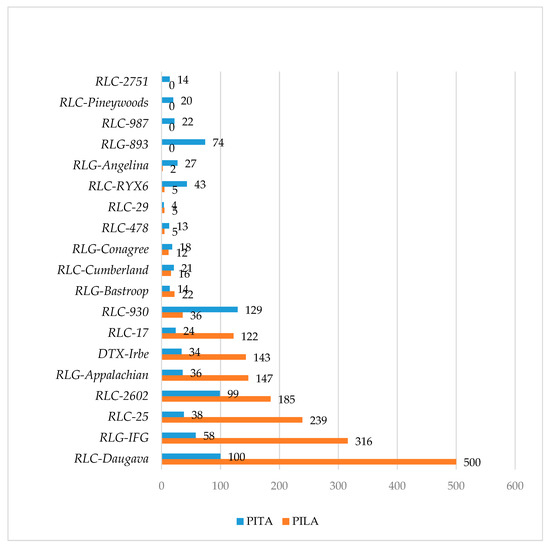 Comparison of TE distribution in gene non-coding regions of high-quality genes of the P. lambertiana genome v.1.01 (PILA) and filtered annotated gene set of P. taeda v.2.0 (PITA).