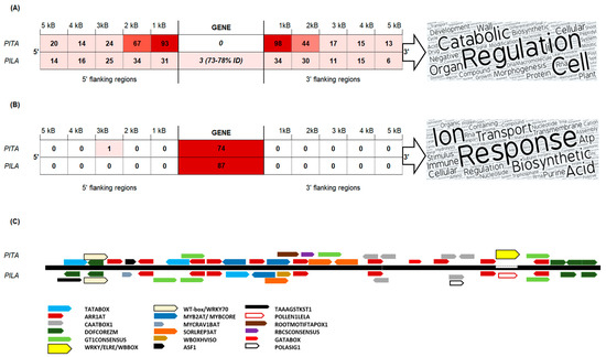 (A) Distribution of Plater MITE insertions across P. taeda (PITA) and P. lambertiana (PILA) gene-flanking regions. (B) Distribution of Plater MITE insertions across P. taeda (PITA) and P. lambertiana (PILA) gene introns. World cloud generated from biological process GO terms of P. taeda genes involved in the networks using the online tool https://wordart.com/. (C) Alignment of P. taeda (PITA) and P. lambertiana (PILA) consensus sequences with predicted plant cis-acting regulatory elements.