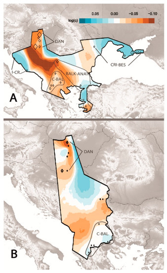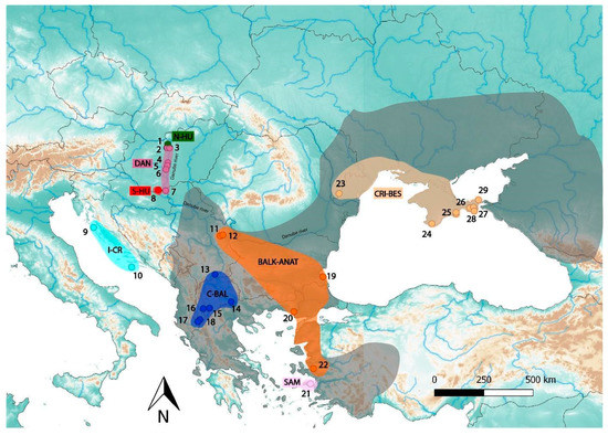 The Estimated Effective Migration Surfaces confirmed the observed pattern of the clustering analyses (Figure 3). Higher migration rates in the northern Black Sea region (CRI-BES) suggested a larger and more continuous population. Despite the possible migration corridor along the Danube River, lower migration in the DAN group pointed out the discontinuity and isolation of populations. Lower-than-average migration within the C-BAL group and between C-BAL and BALK-ANAT suggest geographic barriers of gene flow, such as the Dinaric Alps separating the continental Balkan Peninsula from the Adriatic Sea.