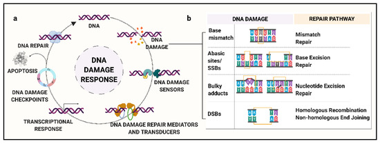 Pictorial representation of (a) DNA damage response and (b) types of DNA damage and their repair pathways. (a) DNA damage response includes the recognition of DNA damage by DNA damage sensors, recruitment of DNA damage repair mediators and transducers, modulation of transcriptional response, activation of DNA damage checkpoint kinases, and lastly, restoration of DNA duplex or apoptosis signaling if the damage is unrepairable. (b) Types of DNA damage include base mismatches repaired via mismatch repair pathway, abasic site or SSBs repaired via base excision repair, bulky adducts repaired via nucleotide excision repair, and DSBs repaired via homologous recombination or non-homologous end joining. DNA, deoxyribonucleic acid; SSBs, single-stranded DNA breaks; DSBs, double-stranded DNA breaks. Created with BioRender.com.