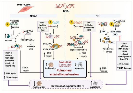 Dysregulated DNA damage response genes involved in pro-proliferative and apoptosis resistance characteristics of PAH-PASMCs. The figure represents the DDR genes and their downstream pathways implicated in PAH pathogenesis (1) PARP-1, (2) PIM-1, (3) EYA3, and (4) CHK1. These genes are upregulated in PAH-PASMCs leading to increased DNA repair and proliferation and reduced apoptosis. Studies have shown specific pharmacological inhibitors like ABT-888 (PARP1 inhibitor), SGI-1776 (PIM1 inhibitor), Benzarone (EYA3 inhibitor), and MK-8776 (CHK1 inhibitor) downregulate their target genes, leading to reduced proliferation and increased apoptosis, suggesting their therapeutic potential in PAH. DSBs, Double-stranded breaks; NHEJ, Non-Homologous End Joining; HR, Homologous Recombination; DSBs, Double-strand breaks; PARP1, Poly (ADP-Ribose) Polymerase 1; PIM1, Proto-Oncogene Serine/Threonine Kinase; EYA-3, Eyes Absent Homolog 3; CHK-1, Checkpoint Kinase 1; KU70, X-Ray Repair Cross Complementing 6; KU80, X-Ray Repair Cross Complementing 5; NFAT, Nuclear Factor of Activated T-Cells; HIF1α, Hypoxia-Inducible Factor 1-α; H2AX, H2a Histone Family Member X; P, phosphoryl group; ATR, Ataxia Telangiectasia and Rad3-Related Protein; miR223, microRNA 223; miR204, microRNA 204; miR424, microRNA 223; DNA-PKs, DNA-Dependent Protein Kinases; PAH, Pulmonary Arterial Hypertension. The numbers represented in square brackets cite the reference for that study. Created with BioRender.com.