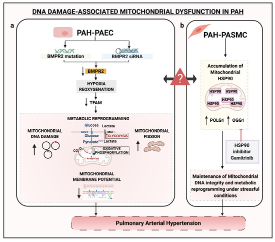 DNA damage-associated mitochondrial dysfunction in (a) PAH-PAEC and (b) PAH-PASMC. (a) In PAH-PAECs, reduced expression of BMPR2 accompanied by hypoxia-reoxygenation is associated with reduced expression of the mitochondrial DNA maintenance gene, TFAM, increased mitochondrial DNA damage, and decreased mitochondrial membrane potential. These factors, associated with reduced oxidative phosphorylation and increased glycolysis, trigger endothelial dysfunction in PAH-PAECs [78]. (b) In PAH-PASMCs, increased mitochondrial HSP90 accumulation along with an increased expression of POLG1 and OGG1 is proposed as a regulatory mechanism in the maintenance of mitochondrial DNA and metabolic reprogramming under stressful conditions [88]. The question mark symbol between the two cell types indicates a lack of studies showing crosstalk between the two cell types. DNA, Deoxyribonucleic acid; TFAM, Transcription Factor A Mitochondrial; GLUT, Glucose transporter; MCT, monocarboxylate transporter; O2, Oxygen; CO2, Carbon dioxide; HSP90, Heat shock protein 90; POLG1, Mitochondrial DNA polymerase γ; OGG1, 8-Oxoguanine glycosylase. Created with BioRender.com.