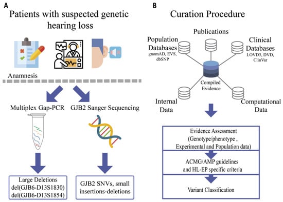 - Feldmann, D.; Denoyelle, F.; Chauvin, P.; Garabédian, E.-N.; Couderc, R.; Odent, S.; Joannard, A.; Schmerber, S.; Delobel, B.; Leman, J.; et al. Large deletion of the GJB6 gene in deaf patients heterozygous for the GJB2 gene mutation: Genotypic and phenotypic analysis. Am. J. Med. Genet. A 2004, 127A, 263–267. [Google Scholar] [CrossRef] [PubMed]