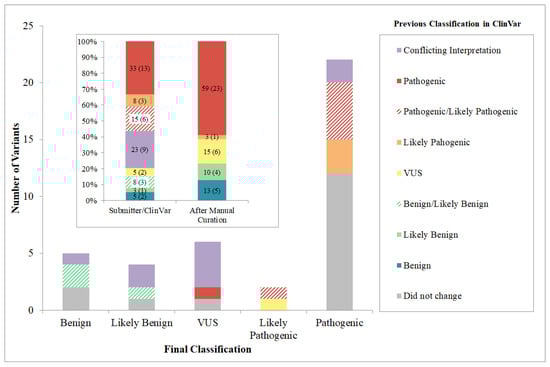 - Harrison, S.M.; Dolinsky, J.S.; Knight Johnson, A.E.; Pesaran, T.; Azzariti, D.R.; Bale, S.; Chao, E.C.; Das, S.; Vincent, L.; Rehm, H.L. Clinical laboratories collaborate to resolve differences in variant interpretations submitted to ClinVar. Genet. Med. 2017, 19, 1096–1104. [Google Scholar] [CrossRef]