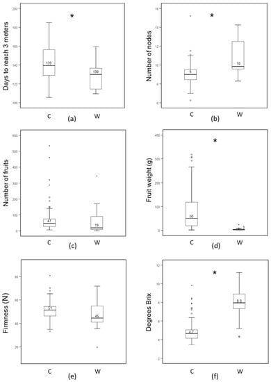 Distribution of fruit yield and fruit quality-related traits among the core collection based on the two classes of genotypes, cultivated (C) and wild (W). (a) Plant growth speed; (b) Time to flowering; (c) Fruit number; (d) Fruit weight; (e) Fruit firmness; and, (f) Degrees Brix. Traits marked with * show a significant difference (t-test, p < 0.05) between cultivated and wild accessions. Numbers in the plots represent the median value. Outliers are marked with an open circle and far outliers with an asterisk, according to SPSS criteria.