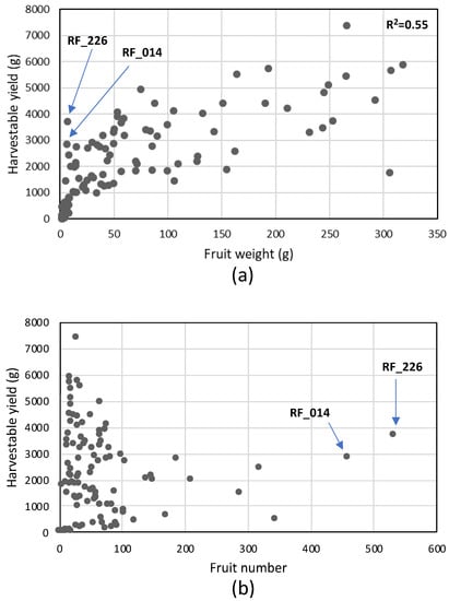 Scatter plot of fruit weight (a) and fruit number (b) versus harvestable yield.