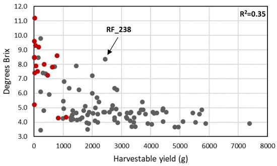 The relationship between Brix (soluble solids content) and harvestable yield. Black dots: cultivated tomato accessions; red dots: wild tomato relatives. The relative outlier RF_238 (see text) is indicated with an arrow.