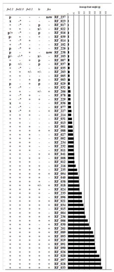 Allelic variation for seven quantitative trait loci (QTLs) for fruit size and weight was investigated by comparing the resequencing data with the published underlying genotypes, as far as they are known so far: fruit weight 2.2 (fw2.2) [38], fruit weight 3.2 (fw3.2) [39], fruit weight 11.3 (fw11.3) [40], locule number (lc) [13], fasciated (fas) [41], ovate [32], and sun [15]. Most cultivated accessions contained the modern, cultivated (large fruit) allele of fw2.2. In contrast, a minority consisting of more primitive S. lycopersicum accessions contained alleles that were highly similar to those found in our resequenced S. pimpinellifolium accessions (Table 2). Two additional accessions contained novel alleles that could not be matched to either the modern cultivated allele or the “S. pimpinellifolium allele”. The relationship between size locus haplotype and fruit weight derived from our phenotyping effort is shown in Figure 9. The cultivated accessions with the S. pimpinellifolium allele of fw2.2 have fruits smaller than 10 g. In contrast, the modern, cultivated allele of fw2.2 is present in all large-fruited accessions (>25 g) in the collection, which is consistent with it being required for large fruit size. Similarly, all of the large-fruited accessions (>25 g) contained the modern large fruit allele of fw11.3. For fw3.2, cultivated accessions were more equally distributed between having the “wild” or the “modern” (larger fruit) allele. The results of our phenotyping show that all of the fruits with a weight higher than 40 g, with one exception, contain the modern allele of fw3.2 (Figure 9).