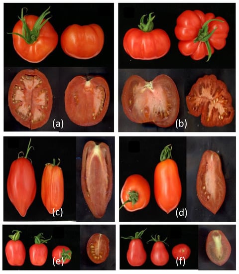 - Brewer, M.T.; Moyseenko, J.B.; Monforte, A.J.; van der Knaap, E. Morphological variation in tomato: A comprehensive study of quantitative trait loci controlling fruit shape and development. J. Exp. Bot. 2007, 58, 1339–1349. [Google Scholar] [CrossRef] [PubMed]