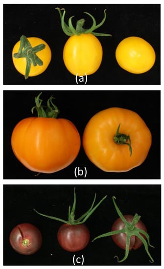 - Lippman, Z.; Tanksley, S.D. Dissecting the genetic pathway to extreme fruit size in tomato using a cross between the small-fruited wild species Lycopersicon pimpinellifolium and L. esculentum var. Giant Heirloom. Genetics 2001, 158, 413–422. [Google Scholar] [PubMed]