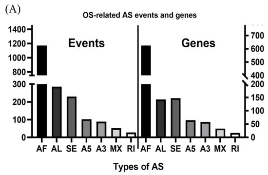 Overview of overall survival (OS)-related alternative splicing (AS) events. (A) The number of the seven types of OS-related AS events and genes involved in our lung adenocarcinoma (LUAD) cohort. (B) Venn diagrams showing the interrelationships between genes for LUAD in Taiwanese patients and The Cancer Genome Atlas (TCGA) databank. AF/AL: alternative first/last exons; SE: skipping exon; A5/A3: alternative5’/3’ splice site events; MX: mutually exclusive exons; RI: retained intron
