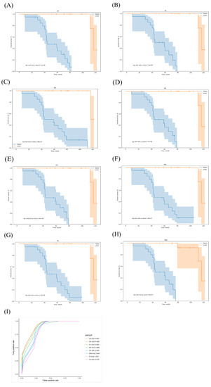Kaplan–Meier and receiver operating characteristic (ROC) curves of the prognostic predictors in our LUAD cohort. (A–G) Kaplan–Meier curves of the prognostic predictors constructed for each type of AS event. Blue line indicates high-risk group; red line indicates low-risk group. (H) Kaplan–Meier curves of the mixture (MIX) prognostic predictor constructed for all types of AS events. (I) ROC analysis for all prognostic predictors. The colored lines of the ROC curves of the prognostic predictors represent different types of AS events.