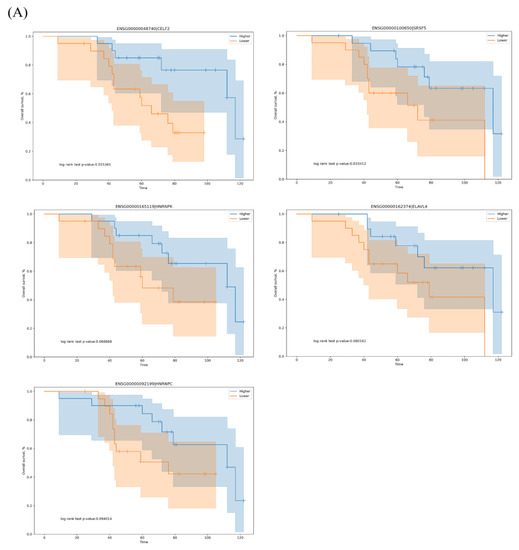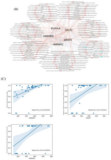 A total of 71 SFs were obtained from the SpliceAid2 database (www.introni.it/spliceaid.html). We conducted survival analysis of the SFs based on gene expression to determine which SFs were associated with OS-related AS events in LUAD. The top five significant OS-related SFs were CELF2, SRSF5, HNRNPK, ELAVL4 and HNRNPC (p < 0.1), and Kaplan–Meier curves showed that high expression of these SFs correlated with good outcomes (Figure 6A).