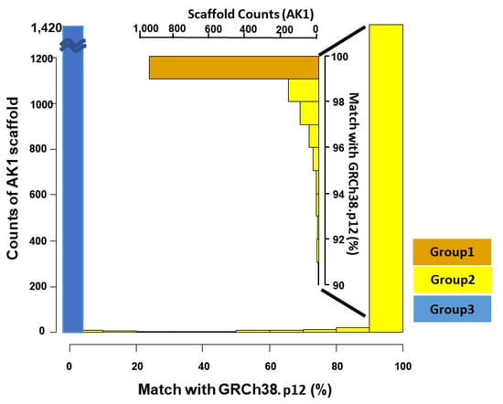 A systematic comparison between AK1 scaffolds (n = 2382) and GRCh38.p12. The degree of match divided AK1 scaffolds into three distinct patterns of synteny by LASTZ []. The x axis (and vertical pop-up axis for Group 1) represents the percent of matches between AK1 scaffold and GRCh38.p12 chromosomes, and the y axis represents the count of scaffolds. GRCh38.p12, Genome Reference Consortium Human Build 38 patch release 12.