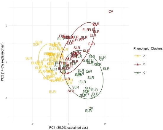 Overall, a wide pattern of phenotypic variation was observed for all the traits, as shown by the PCA analysis, where the accessions were differentiated into three groups based on the hierarchical clustering obtained with the same data (Figure 1, yellow, red, green). The landraces from Sardinia were present in all of the three groups, as well as the exotic landraces and modern/vintage cultivars, thus showing that the subdivision into varietal types (i.e., ELR, SLR, CV) does not overlap with the clustering based on phenotypic variance. While we should remark that less than the 50% of the phenotypic variance is explained by the first two principal components.