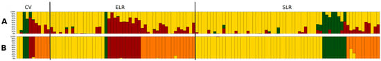 The genetic differentiation (FST) among the groups was 0.07 on average and was always statistically significant. Moreover, the proportion of shared alleles indicated higher similarity between SLR and ELR than between CV and ELR (Table 3). On the other hand, SLR and ELR showed 11 and 50 private alleles, respectively, while only one private allele was detected in CV (Supplementary Table S8).