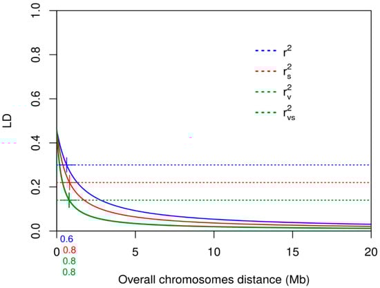 - Hill, W.G.; Weir, B.S. Variances and covariances of squared linkage disequilibria in finite populations. Theor. Popul. Biol. 1988, 33, 54–78. [Google Scholar] [PubMed]