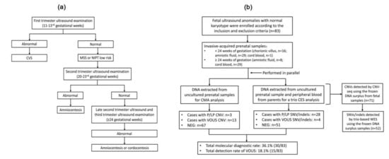 The study protocol was approved by the medical ethics committee of the Children’s Hospital affiliated to Zhejiang University. In this prospective observational study, a total of 83 fetuses were enrolled for prenatal diagnosis at the Peking Union Medical College Hospital from May 2016 to July 2019. The workflow of the ultrasound examination was as follows (Figure 1a): the first trimester ultrasound was performed between 11 to 13 + 6 gestational weeks, and the second trimester (20 to 23 + 6 weeks) was performed on pregnant women with a negative result from non-invasive prenatal testing (NIPT) or maternal serum screening (MSS). The late second trimester (24 to 28 weeks) and the third trimester (30 to 32 weeks) ultrasound examination were conducted after those tests. All cases met the following inclusion criteria: (1) informed consent procedure for prenatal genetic diagnosis from the parents was provided according to program grant for National Key R&D Program of China “assessing the national integrated birth defect prevention model” (grant number 2018YFC1002704, IRB/EC number 2018-IRB-076); (2) singleton pregnancy and a fetus with at least one ultrasonic structural anomaly; (3) fetal sample was obtained through an invasive procedure, including chorionic villus sampling (CVS), amniocentesis or cordocentesis; (4) prenatal genetic diagnosis including karyotyping, CMA and trio-based CES was performed in parallel; (5) all of the above-mentioned testing were performed on each prenatal sample successfully; and (6) karyotyping results were normal. The exclusion criteria included: (1) parents that refused to accept the procedure of genetic analysis simultaneously; and (2) abnormal karyotype results. Fetal samples were obtained by CVS from 16 pregnancies at 12 to 14 weeks of gestation, amniocentesis from 37 pregnancies at 17 to 27 weeks of gestation, and cordocentesis from 30 pregnancies at 23 to 33 weeks of gestation. All procedures were performed via ultrasonography guidance. The peripheral blood of the parents was sampled for a trio analysis.
