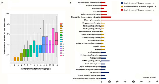 The difference in the number of alternative splicing-related genes. (A) The relationship between the number of annotated isoforms and novel isoforms per gene. (B) Top 10 enriched Kyoto Encyclopedia of Genes and Genome (KEGG) pathways of genes with different numbers of AS events (ASEs). Blue bars represent genes with one ASE, yellow bars represent genes with 1 < ASEs ≤ 10, and red bars represent genes with >10 ASEs.
