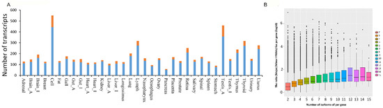 To identify developmentally regulated changes in AS, StringTie [36] was used to quantify the expression of novel and known transcripts in different tissues (Table S8). The average level of expression of novel transcripts in the pancreas, liver, longissimus dorsi, spleen, prostate, adrenal gland, and breast was higher (FPKM > 10) than that of known transcripts. The difference in the expression level of transcripts between the highest expression transcript and the lowest expression transcript was compared (the ratio of major FPKM and minor FPKM) to the gene whose number of AS events was greater than 1. This revealed that more isoforms of a gene are associated with a greater difference in its highest and lowest expression (Figure 3B). A total of 116,439 genes were tissue-specific, of which 109,773 genes were newly detected. A total of 5,683 genes were expressed across all 34 tissues, suggesting that many genes are expressed in multiple tissues simultaneously (Table S9). These results are useful resources for improving the transcript annotations of the pig genome.