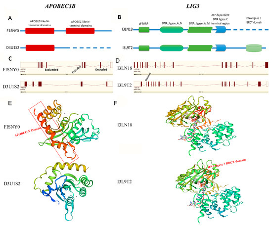 Examples of proteins encoded by known transcripts compared with those encoded by novel transcripts. (A) Apolipoprotein B MRNA editing enzyme catalytic subunit 3b (APOBEC3B)’s loss of an APOBEC-like N-terminal domain. (B) DNA ligase 3 (LIG3)’s gain of a DNA ligase 3 BRCA1 C-terminal (BRCT) domain. (C,D) The number of coding exons of APOBEC3B and LIG3. (E,F) The predicted protein conformations of APOBEC3B and LIG3.