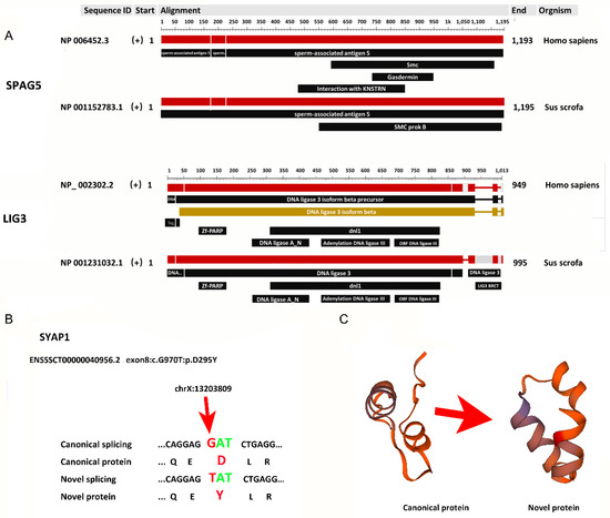 (A) Example of a homologous protein related to an AS gene between human and pig (downloaded from NCBI Multiple Sequence Alignment Viewer, Version 1.15.0). (B) Effect of single nucleotide polymorphism (SNP) mutation of synapse-associated protein 1 (SYAP1) on alternative splicing. (C) Protein conformation of canonical and novel isoforms as predicted by the Swiss model.