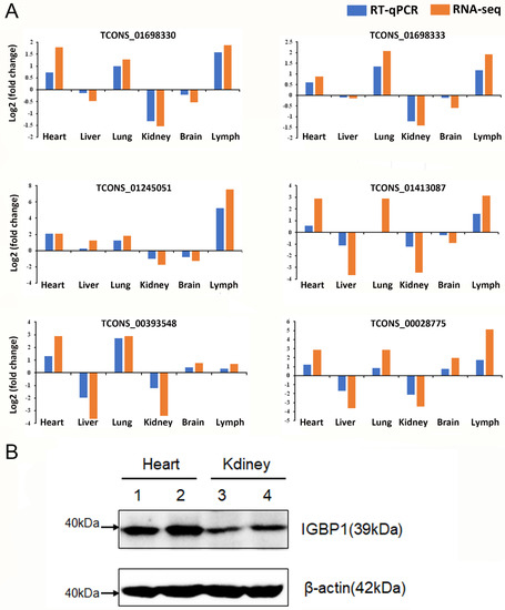 (A) Validation of transcripts using RT-qPCR. Blue bars and red bars represent gene expression measured with RT-qPCR and RNA-seq, respectively. (B) The protein level of Immunoglobulin Binding Protein 1 (IGBP) using western blotting.