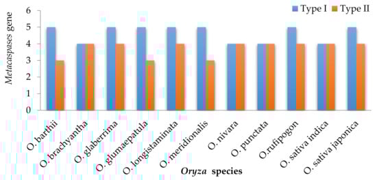 The metacaspase genes have been studied in several plant species to understand their role in stress and developmental phases of the growth cycle [29,47]. The number of metacaspases in plant species varies considerably, for instance, 6 in grapes, 8 in rice and tomato, 9 in Arabidopsis, and 30 in cotton species [18]. Such wide range of occurrence may be due to the high level of variation in duplicated genome and ploidy level in plants. The genome-wide study of metacaspases in the Oryza clade will help to better understand its functional role and evolution in rice. The in-depth understanding of metacaspases in wild relatives will also provide an opportunity to introduce desirable alleles from wild genetic resources. Here, identification, characterization, and distribution of metacaspase genes in ten Oryza species were performed, which uniformly identified 8 or 9 homologs in each species despite having differences in the origin of the genomes (AA, BB, or FF) (Figure 1, Table 1). Recently, genome-wide identification of metacaspase genes performed in four Gossypium species identified a varying number of homologs: 16 in G. raimondii, 17 in G. arboreum, 26 in G. hirsutum, and the highest, 30, in G. barbadense [48]. Such a wide variation among Gossypium species as compared to the Oryza species is mostly due to the higher ploidy level and proportion of the duplicated genome.
