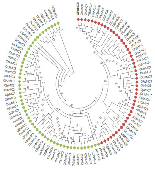Neighbor-Joining phylogenetic tree of metacaspase genes from wild and cultivated Oryza species. The phylogenetic tree comprising 92 Oryza and 9 Arabidopsis metacaspase genes was generated using Mega X software. Red square tiles represent Type II metacaspase genes whereas green square tiles indicate Type I metacaspases. Gene nomenclature used OJa for japonica, OIn for indica, ORu for rufipogon, ONi for nivara, barthii is named as OBa, brachyantha as OBr, glumaepatula as OGl, glaberrima as OGb, OPu stands for punctata, OMe stands for meridionalis, and OLo is for longistaminata, and MC denotes the metacaspase family, which is followed by a numeral representing the specific gene.