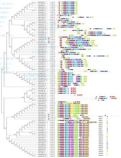 A thorough study was conducted to analyze the gene structure and conserved domains present in the metacaspase proteins in the Oryza species. An exon–intron organization for all the metacaspase genes in wild and cultivated rice species was constructed to understand the variations in the coding and non-coding metacaspases sequences (Figure 3). The number of introns in the metacaspase genes is highly variable, spanning from as low as one to as high as thirty introns. Exceptionally, ORuMC9, OJaMC9, OInMC8, OGbMC9, OJaMC6 genes were found to be intron-less, whereas OPuMC8, ONiMC8, OMeMC8, OLoMC9 genes had more than 25 introns. The genes coding for longer metacaspases possessed a higher number of introns. Interestingly, the protein length of all genes with no intron was 341 amino acids with the exception of OJaMC6 (305 amino acids). A total of twenty conserved motifs were identified in metacaspase proteins using the MEME software tool (Figure 4). Subsequently, a CDD search was performed to annotate the identified motifs. Interestingly, the domain architecture in Type II metacaspases was very much similar to that in the Type I metacaspases group.