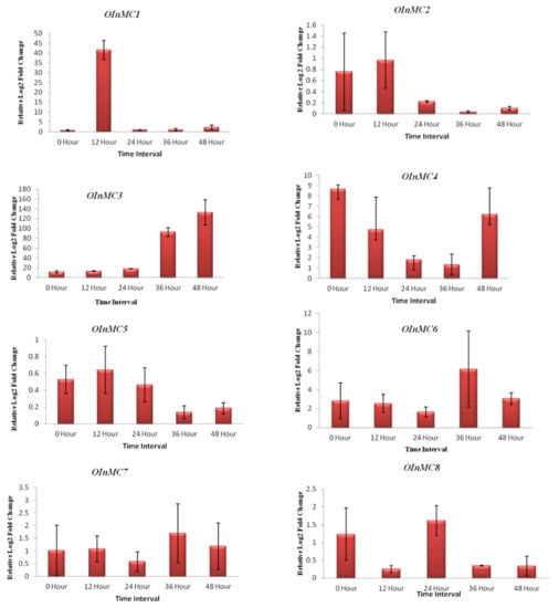 Relative log 2-fold change of the eight (OInMC1-8) genes with response to biotic stress posed by Magnaporthe oryzae at different time intervals after inoculation on rice cultivar Pusa Basmati 1. The house-keeping gene Ubiquitin was used as a reference to normalize the expression values of target genes. The relative expression calculations were performed using the 2−ΔΔCt formula [43] for three biological and technical replicates each.