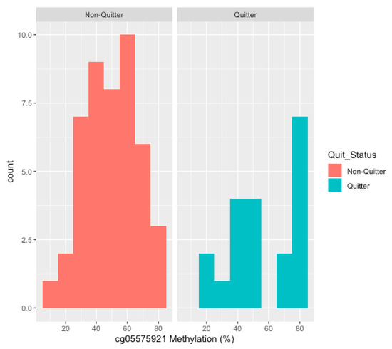 The distribution of the methylation values at study intake. On the left, the distribution of cg05575921 methylation at intake in the non-quitting subjects (n = 47). On the right, the distribution of cg05575921 methylation levels at intake in the subjects who quit smoking (n = 20).