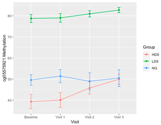 Average methylation values (%) for each group at study intake and each monthly visit. Error bars indicate the standard deviation of methylation for each group. Non-quitter, NQ (n = 47), low demethylation smokers (LDS) (n = 9) and high demethylation smokers (HDS) (n = 11).