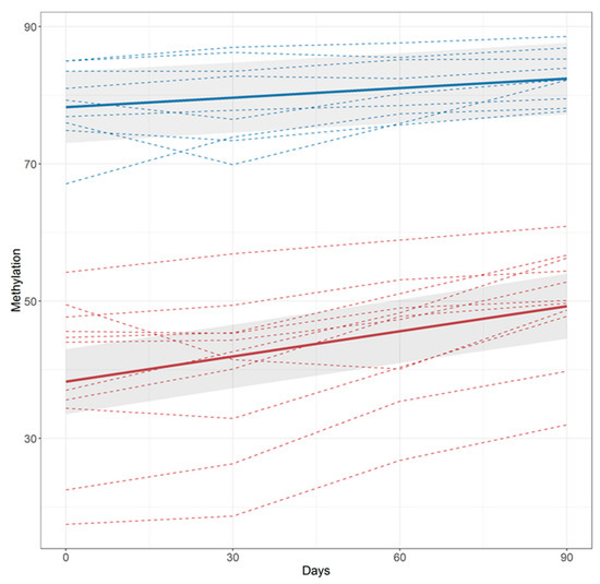 Using linear mixed effects regression, we analyzed the relationship between DNA methylation as a function of time from cessation for both the LDS and HDS groups (Figure 3) across the three-month period that the subjects were followed. Time, group, and their interaction were all associated with changes in cg05575921, while sex and baseline age showed no evidence of association. Figure 3 shows the estimated curves for the HDS group (solid red) and the LDS group (solid blue), along with curves for each individual (HDS subject: dashed red; LDS subject: dashed blue) subject. Those in the HDS group had a larger estimated percentage cg05575921 methylation slope than those in the LDS group (0.12%/day (95% CI: 0.096, 0.15) vs. 0.046%/day (95% CI: 0.018, 0.074); p < 0.0003).