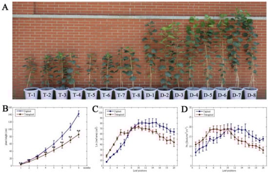 Eight genotypes of Populus tetraploids (2n = 4x = 76) (T-1, T-2, T-3, T-4, T-5, T-6, T-7, and T-8) and their counterpart diploids (2n = 2x = 38) (D-1, D-2, D-3, D-4, D-5, D-6, D-7, and D-8) were used in this study. The eight genotypes of tetraploid plants used in the study were previously induced by chromosome doubling of diploid hybrid progeny ((Populus pseudo-simonii × P. nigra Zheyin3#) × (P. × beijingensis)) through colchicine treatment []. Healthy shoots of tetraploid and counterpart diploid plants were grown for 30 days in half-strength MS (Murashige and Skoog) root medium (3% (w/v) sucrose, 0.6% (w/v) agar, 0.49 μM IBA (indolebutyric acid)) and then transplanted into substrate (sand, turf, and peat, 1:1:1 v/v/v) in plastic pots (25 cm in diameter × 25 cm in depth); we transplanted 15 uniform 2x and 4x seedlings of each genotype. All plant materials were grown in the greenhouse of the National Engineering Laboratory for Tree Breeding (Beijing, China) with 18/26 °C (night/day) and relative humidity of 45–70%.
