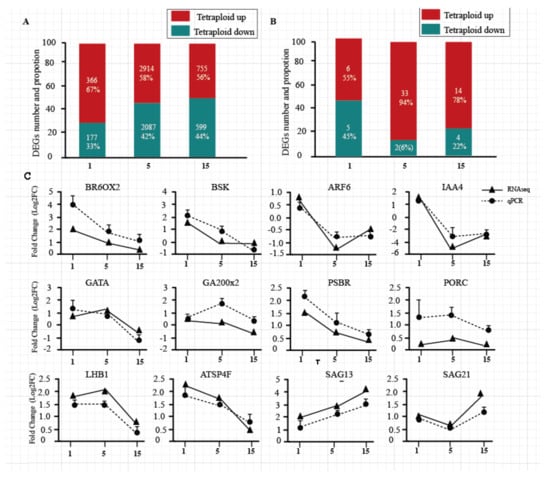 Differentially expressed genes (DEGs) and RT-PCR validation. (A) The numbers and proportions of upregulated and downregulated DEGs in the 1st, 5th, and 15th leaves of tetraploid plants. (B) The numbers and proportions of upregulated and downregulated microRNAs (miRNAs) in the 1st, 5th, and 15th leaves of tetraploid plants. (C) Confirmation of expression profiles of these genes using qRT-PCR. The fold changes in expression values for qRT-PCR were calculated by comparing the expression values of genes in 1st, 5th, and 15th leaves of tetraploid and diploid plants using the 2−ΔΔCt method. The absolute fold changes were converted to log2 fold change (FC). Data are presented as means ± standard deviation (SD) from three independent experiments.