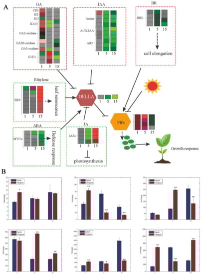 GA3-oxidase and GA20-oxidase are two key enzymes in the synthesis of gibberellin []. GA3-oxidase can suppress light-mediated hypocotyl elongation by inhibiting chlorophyll biosynthesis []. GID1, a gene for a gibberellin (GA) receptor, can improve the sensitivity to GA and involved in GA signaling []. IAA17, a repressor of auxin-inducible gene expression, positively modulates natural leaf senescence through melatonin-mediated pathway in Arabidopsis []. GH3 negatively regulates auxin synthesis and causes plant dwarfism []. ARF6 and ARF8, two auxin response factors, regulate jasmonic acid biosynthesis and floral organ development [,]. Furthermore, expression of ARFs is controlled by miR167 []. BRI1 is involved in brassinosteroid signal transduction, whereby it binds at an extracellular site and results in phosphorylation of the kinase domain, which activates the BRI1 protein leading to BR responses [,]. PAO1, CLH1, CLH2, and POR all play important roles in the process of chlorophyll synthesis []. PSAF and PSBR participate in photosynthesis and encode the subunits of PSⅠ (photosystemⅠ)and PS Ⅱ(photosystem Ⅱ), respectively [,]. SUS, SS, AMY, EMB, and BAM are all involved in starch synthesis and decomposition []. SPS promotes sucrose synthesis []. Gene expression analysis of dwarfed tetraploid apple plants found that AUX1, ARF3, DWF4, BKI1, and BIN2 were significantly downregulated genes involved in the pathway of auxin and brassinolide [].