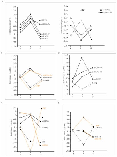 Compared with diploid, the expression of miRNAs and their target genes in different leaf positions of tetraploids. Solid and dashed lines of the same color are miRNAs and corresponding target genes. (A) The expression of miRNA167s and miRNA390 and their target genes ARF. (B) The expression of miRNA156s and miRNA164 and their corresponding target genes GAMYB and GRF. (C) The expression of miRNA393 and miRNA399 and their target genes TIR. (D) The expression of miRNA156s and miRNA164 and their corresponding target genes SPLand NAC. (E) The expression of miRNA172 and miRNA319 and their corresponding target genes AP2-like and TCP.