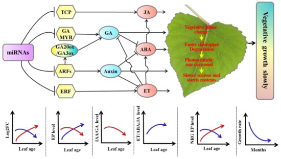 The expression of miRNAs associated with the auxin and GA pathways increased with leaf age, which had a dosage effect in tetraploid Populus. Therefore, gene transcription and expression levels were inhibited by miRNAs, leading to relatively more negative control in target genes, such as ARFs and GAMYB, compared with diploid. In addition, the expression of miRNAs associated with the ET and JA pathways decreased with leaf age, leading to relatively less negative control in target genes by miRNAs, such as ERF and TCP, compared with diploid. The GA and IAA contents, which promote growth hormones, were significantly lower in tetraploids than diploids. However, the contents of JA and ET, which regulate senescence, were significantly higher in tetraploids than in diploids. As a result, leaf senescence in tetraploids was faster than in diploids, and the chloroplast aging rate was relatively faster than in diploids. The photosynthetic rate, as well as sucrose and starch synthesis metabolism, was decreased in tetraploids compared with diploids. Lastly, the Populus tetraploids grew more slowly than diploids (Figure 8).