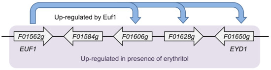 Y. lipolytica is a dimorphic, oleaginous yeast that is being increasingly studied due to its great potential for industrial applications [11]. It produces erythritol under hyperosmotic conditions [12]. The biosynthesis of erythritol proceeds mainly via the pentose phosphate pathway (PPP) [3]. Erythrose-4-phosphate, the metabolite of PPP, is dephosphorylated by a still unknown enzyme to erythrose, which is later converted to erythritol by erythrose reductase [13]. After depletion of the original carbon source in the growth medium, the concentration of erythritol starts to decrease. There are four enzymes known to be involved in erythritol utilization: erythritol dehydrogenase Eyd1 [14], kinase Eyk1 [15], and two isomerases, Eyi1 and Eyi2 [16]. The genes encoding these proteins are regulated by the transcription factor Euf1. All of them, including EUF1, are arranged in a cluster in the genome called the erythritol utilization cluster (Figure 1). Euf1 is most likely not the only factor regulating erythritol utilization, since in its absence the euf1Δ strain may still use erythritol as a carbon source to a small extent [9].