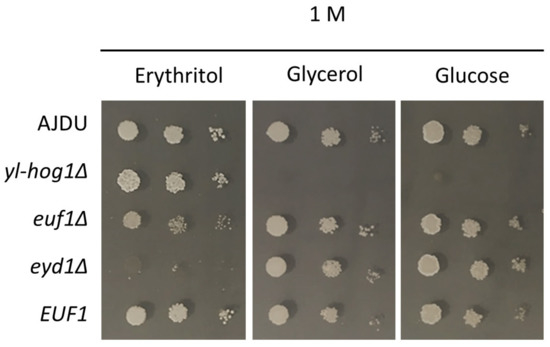 On the other hand, deletion of EUF1, a gene also important for erythritol utilization, had the opposite effect. The strain euf1Δ yl-hog1Δ could not benefit from the addition of erythritol to improve growth under osmotic stress (Figure 5). These results, although contradictory at first, may be of key importance in further investigating the role of erythritol in metabolism. Euf1 is a relatively recently discovered transcription factor [9], and for now it is known to regulate the transcription of only four genes—EYD1, EYK1, EYI1, and EYI2 [16]—all of them being encoding enzymes of erythritol utilization and located in the cluster. If the only role of Euf1 was the regulation of this cluster, the deletion of EUF1 and EYD1 should have the same result. The observed difference indicates that Euf1 also targets other genes involved in erythritol metabolism.
