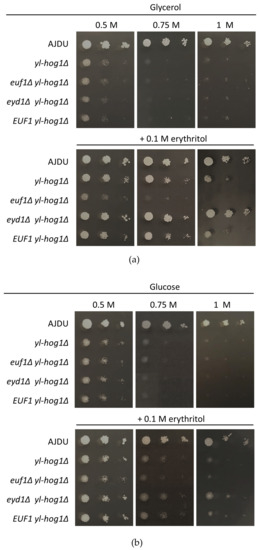 After establishing that EUF1 and EYD1 deletions do not influence the sensitivity to osmotic stress, the deletion yl-Hog1 was added. The strains euf1Δ yl-hog1Δ, eyd1Δ yl-hog1Δ, and EUF1 yl-hog1Δ were all unable to grow at glucose and glycerol levels higher than 0.5 M (Figure 5). However, the addition of erythritol revealed significant differences. The strain euf1Δ yl-hog1Δ did not react to supplementation. Its growth was exactly the same as on plates without erythritol: weak on 0.5 M carbon sources and completely inhibited at higher concentrations. It was a striking contrast to all other tested strains. On the other hand, eyd1Δ yl-hog1Δ reacted to the supplementation more strongly than yl-hog1Δ. On the plates with glycerol as a main carbon source, the growth of eyd1Δ yl-hog1Δ was comparable to the control strain, regardless of the glycerol concentrations (Figure 5a). On glucose plates, eyd1Δ yl-hog1Δ could withstand higher glucose concentrations than other deletion strains, but there was still strong growth inhibition compared to the control strain (Figure 5b). The last created strain, EUF1 yl-hog1Δ, did not differ from yl-hog1Δ in all tested conditions.