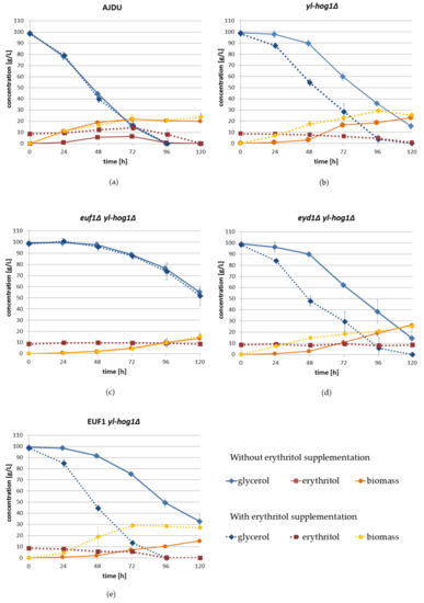 Erythritol supplementation had the most significant impact on glycerol utilization by strain EUF1 yl-hog1Δ (Figure 6e). In the absence of erythritol, the adaptation was slower compared to yl-hog1Δ and eyd1Δ yl-hog1Δ. After 120 h there was 32.7 ± 6.3 g L−1 of glycerol and biomass concentration was 15.3 ± 1 g L−1. When erythritol was in the medium, both glycerol and erythritol were completely depleted in 96 h. Moreover, the biomass reached a high concentration of 29 ± 1.2 g L−1 in just 72 h and remained stable until the end of the experiment.