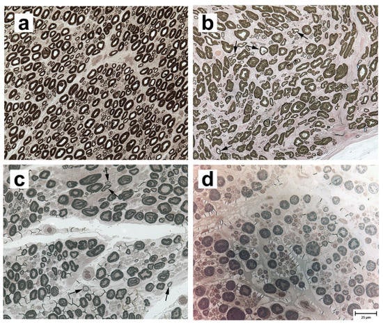 Paraphenylenediamine-stained resin sections from the peroneal nerves of four dogs. (a) An adult normal control Labrador retriever, (b) a nine-year-old LPPN-affected Labrador retriever, (c) a three-year-old LPPN-affected Leonberger, and (d) a three-year-old LPPN-affected Saint Bernard. All three LPPN-affected dogs were homozygous for the CNTNAP1 variant. Arrows in (b) and (c) point to nerve fibers that are inappropriately thin for the axon diameters. Bar in lower right image indicates 25 µm and is valid for all images.