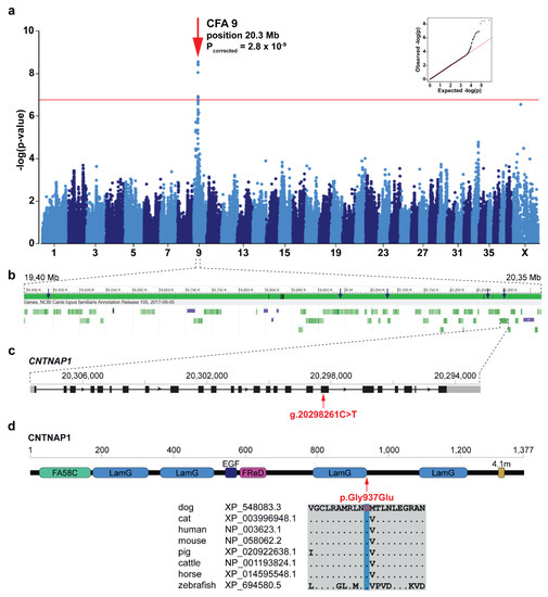 Identification of a new LPPN-associated locus and variant in Leonbergers and Saint Bernards. (a) Manhattan plot for the two-breed genome-wide association study (GWAS) using 144 LPPN-affected dogs and 373 normal control dogs indicates a signal with multiple associated single nucleotide polymorphisms (SNPs) on chromosome 9. The -log p-values for each SNP are plotted on the y-axis versus each canine chromosome on the x-axis. The red line represents the Bonferroni corrected significance threshold (−log(p-value) = 6.76). Inset: Corrected Q–Q plot confirms that the observed p-values of the best-associated markers have stronger association with the trait than expected by chance (null hypothesis, red line). (b) Gene content in the ~0.98 Mb region of interest. Blue arrows show the best-associated markers from GWAS. Green bars represent the different genes and violet bars represent lncRNAs. (c) Schematic representation of the CNTNAP1 gene showing the variant (XM_548083.6:c.2810G>A) location in exon 18. (d) Schematic representation of the CNTNAP1 protein with its domains: coagulation factor 5/8 C-terminal domain (FA58C), laminin G domains (LamG), calcium-binding EGF-like domain (EGF), fibrinogen-related domain (FReD), and putative band 4.1 homologues’ binding motif (4.1m). The CNTNAP1 amino acid substitution (XP_548083.3:p.Gly937Glu) position is shown together with the amino acid multiple alignment indicating the residue is highly conserved across species.